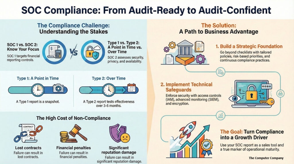 By aligning governance practices with technical enforcement, The Computer Company helps organizations move from simply “audit-ready” to audit-confident—turning SOC compliance into a business advantage and a true marker of operational maturity.